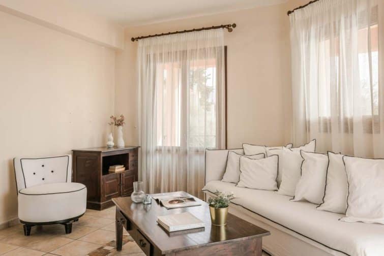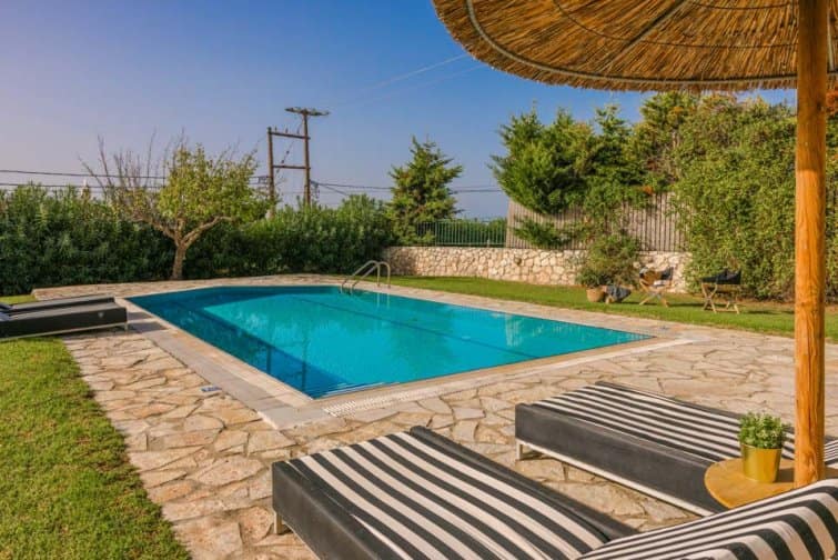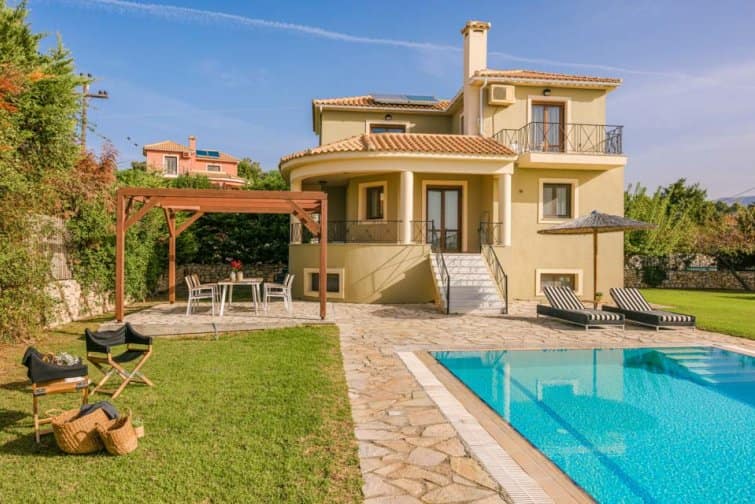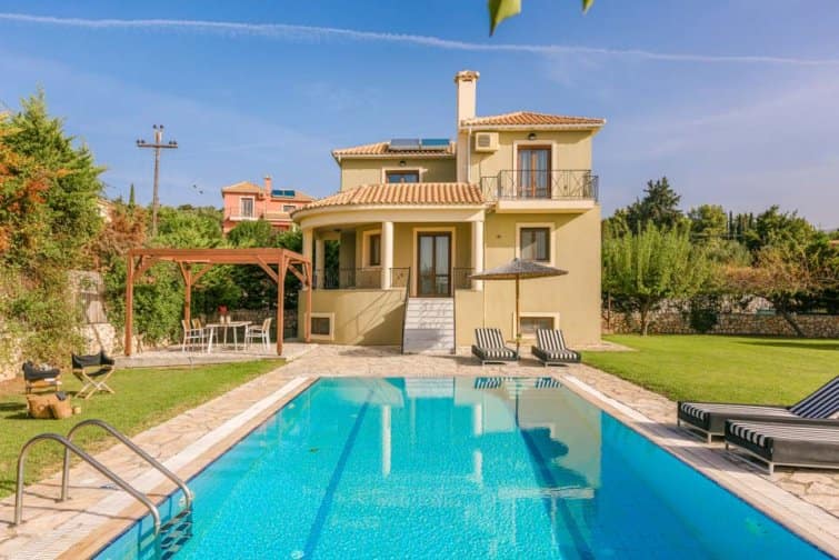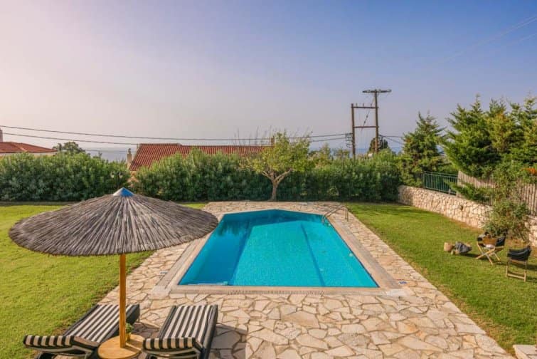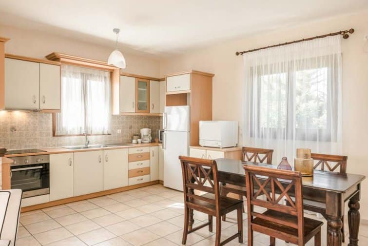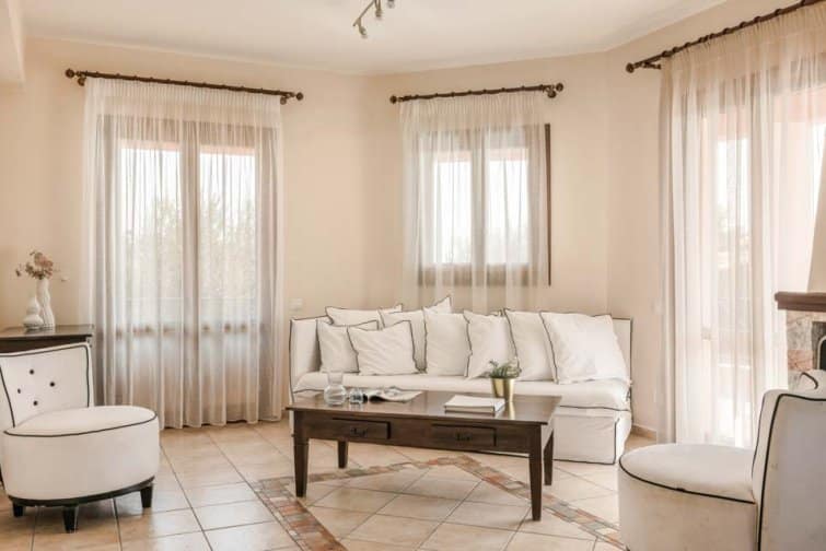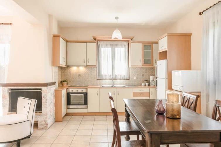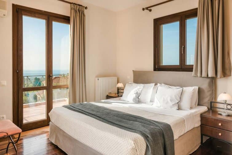 Three bedrooms with balcony access accommodate up to six guests and overlook beautiful Greek landscape. From this height, you are provided panoramic views over the Ionian Sea and into the distance. On the ground floor, an open plan living room, dining area, and fully equipped kitchen make socialising easy with a long dining table and comfortable seating for all the family.