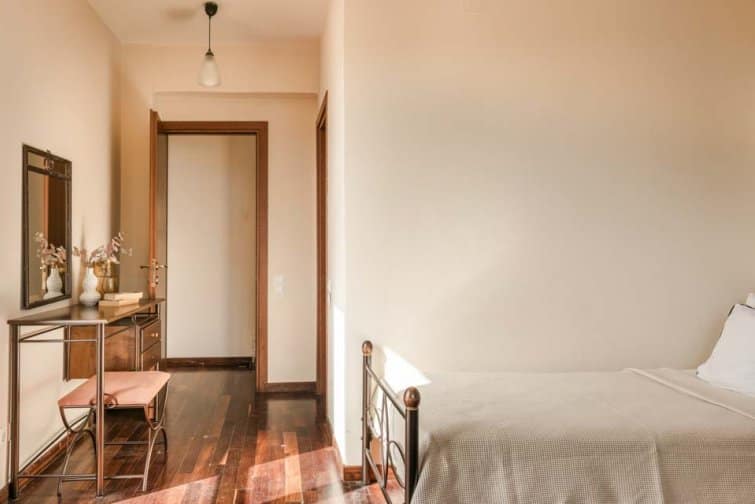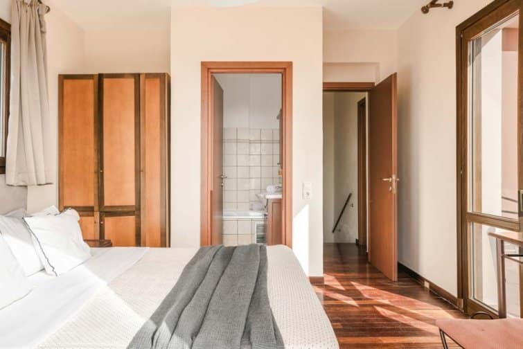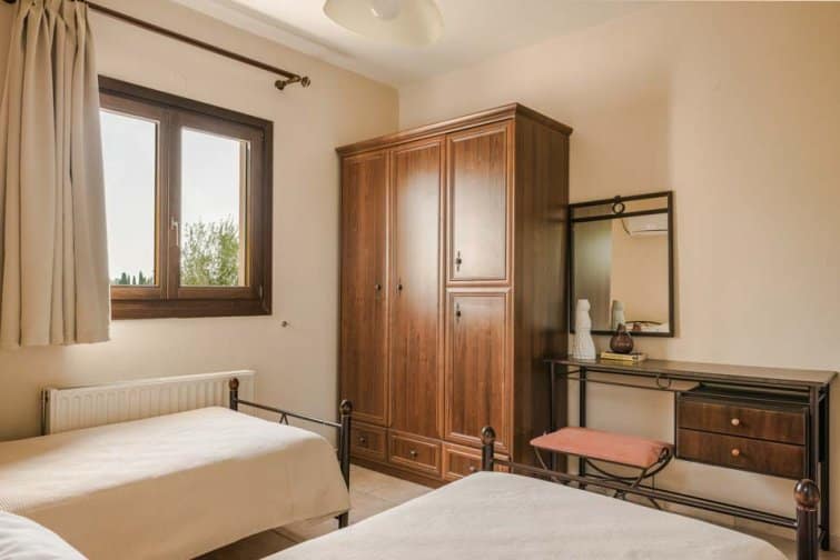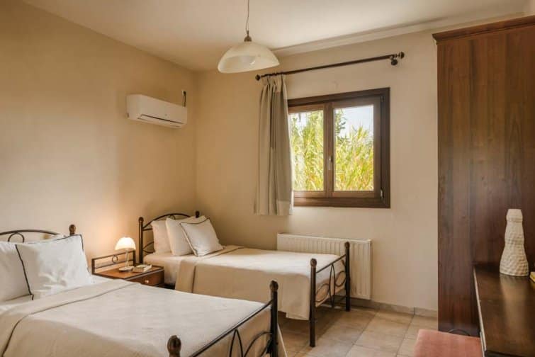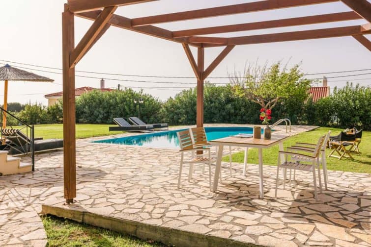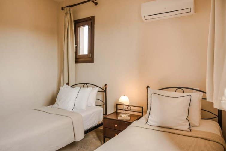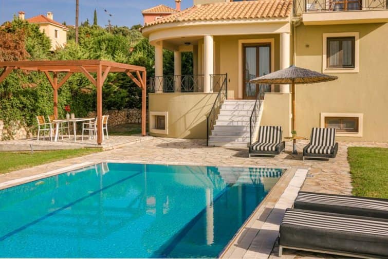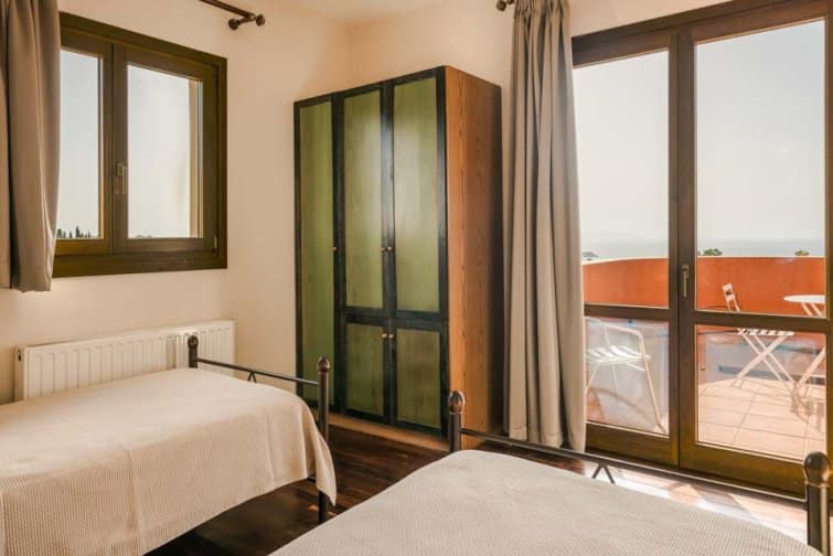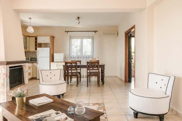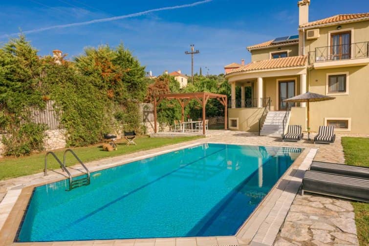 Three bedrooms with balcony access accommodate up to six guests and overlook beautiful Greek landscape. From this height, you are provided panoramic views over the Ionian Sea and into the distance. On the ground floor, an open plan living room, dining area, and fully equipped kitchen make socialising easy with a long dining table and comfortable seating for all the family.