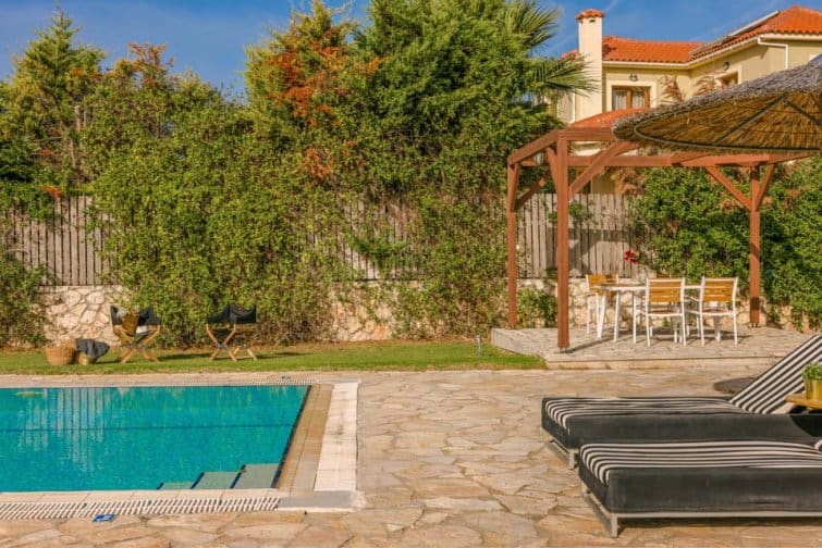 The private swimming pool is surrounded by tropical palm trees and local flora. Set among the idyllic garden, you will also find sun loungers, a shaded terrace, and an alfresco dining area where you can enjoy meals freshly prepared on the barbeque.