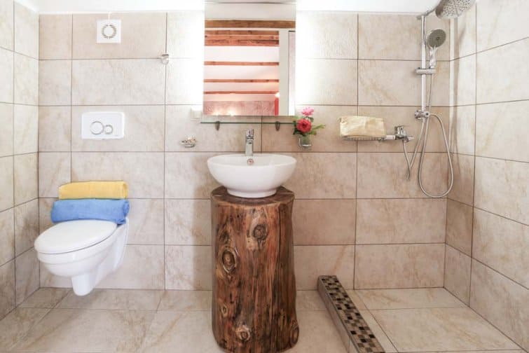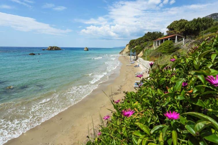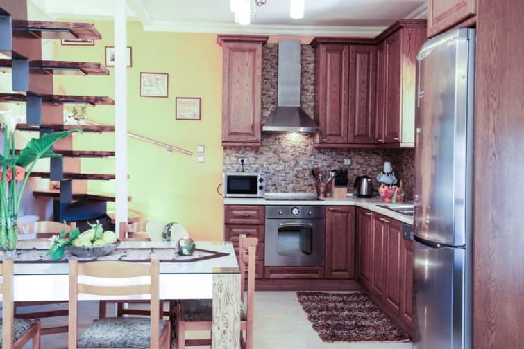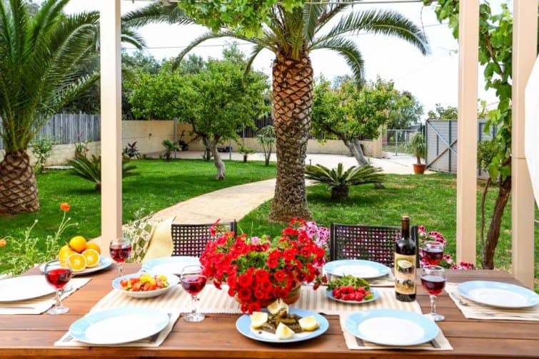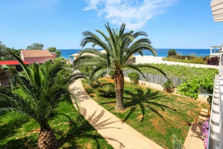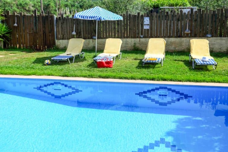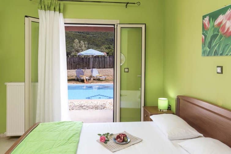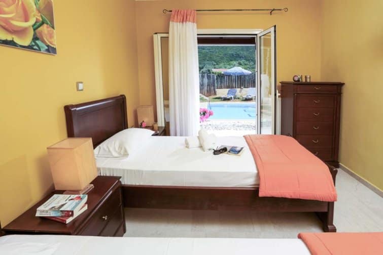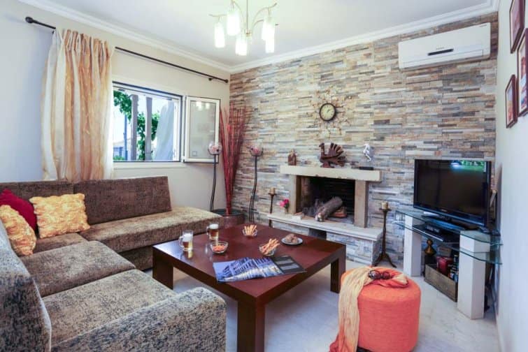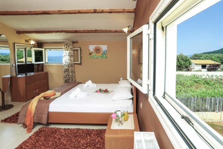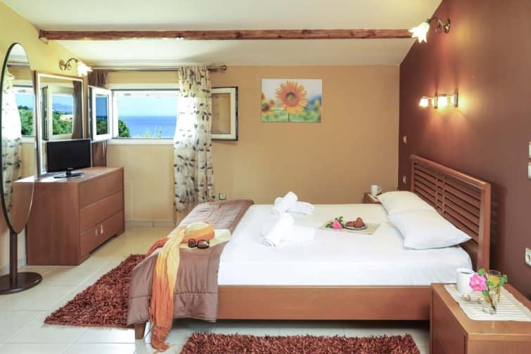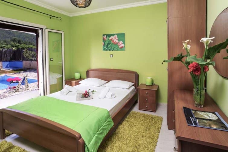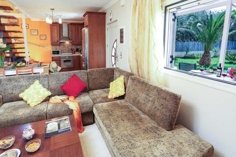Inside, the villa showcases vibrant and colourful designs. The open-plan living room and dining area are cosy and comfortable with air conditioning, Wi-Fi, and a television. With a cooker, dishwasher, microwave and fridge freezer, the fully equipped kitchen has everything you need to cook up a storm during your self-catering getaway to Greece.