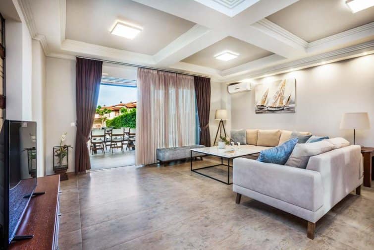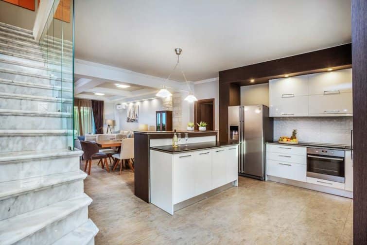 Villa Tesera is a tastefully furnished villa with a fully equipped modern white kitchen with an American fridge and open plan to the comfortable lounge dining area with smart TV.