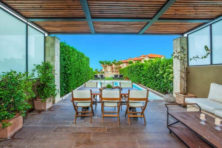 Large glass patio doors then invite you out to the covered porch, where the exterior dining table and lounging area overlook your glistening private pool with an extended shallow end, ideal for children and a lush lawn with sunbeds.