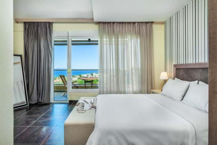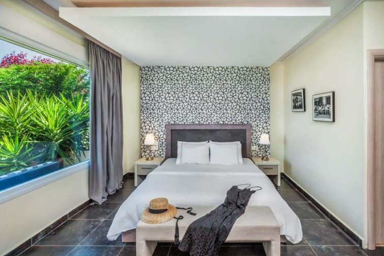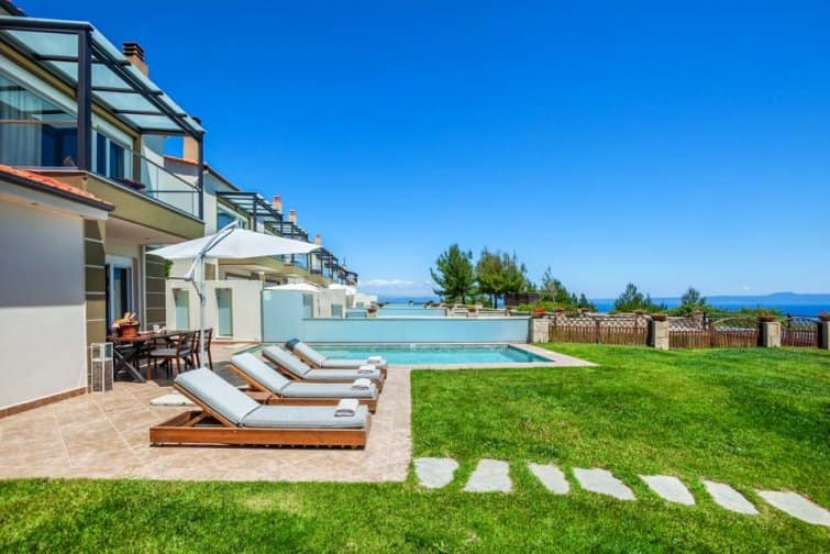 Villa Tria is situated on the family run Sunny Villas & Spa resort which is perched on a hill just above the bustling resort of Hanioti, with its beautiful stretch of beach and a great selection of restaurants and bars and cute shops to wander around.