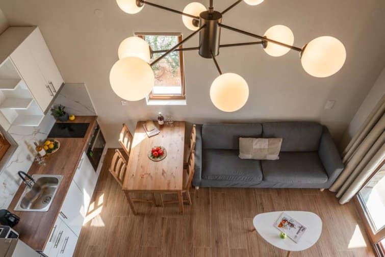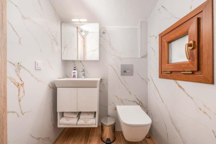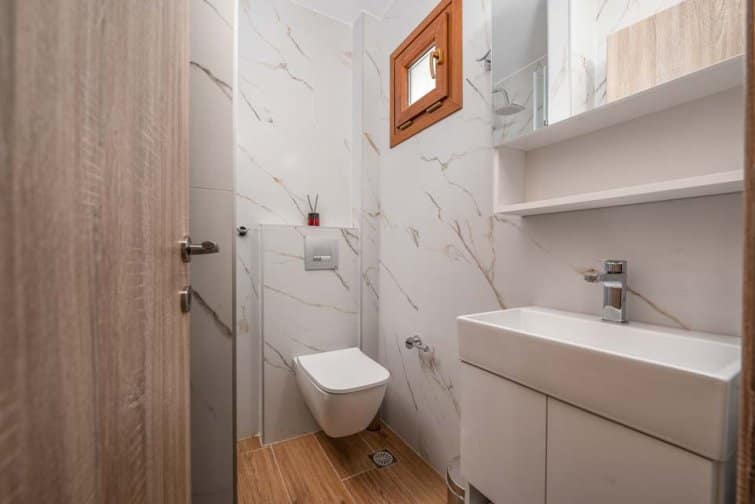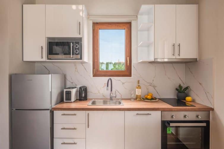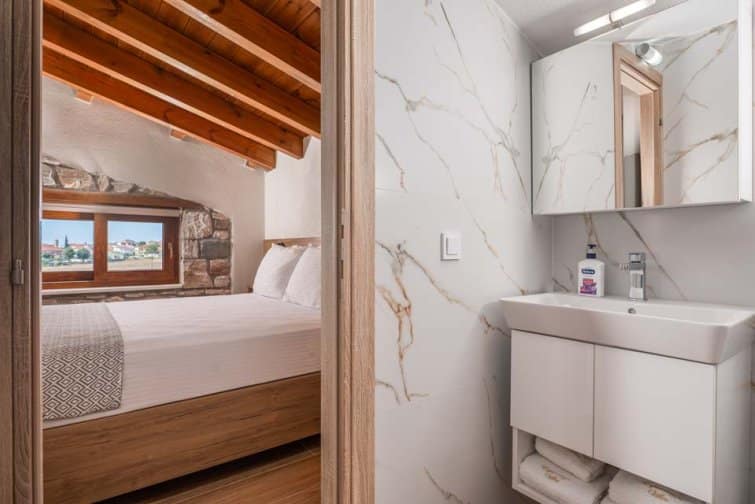 Villa Veronika features a ground floor bedroom with a double bed and a shower room. The upper level of the villa houses another bedroom with a double bed and an en-suite shower room. The light airy living room, located on the ground floor, includes a comfortable sitting area, with views over looking the pool, a dining space, and a fully equipped kitchen for a comfortable stay. The kitchen is supplied with modern amenities, such as an electric oven and stove, dishwasher, and a fridge with a freezer. Additional conveniences provided for guests include a safe deposit box (suitable for laptops), a washing machine, free Wi-Fi, and satellite TV.